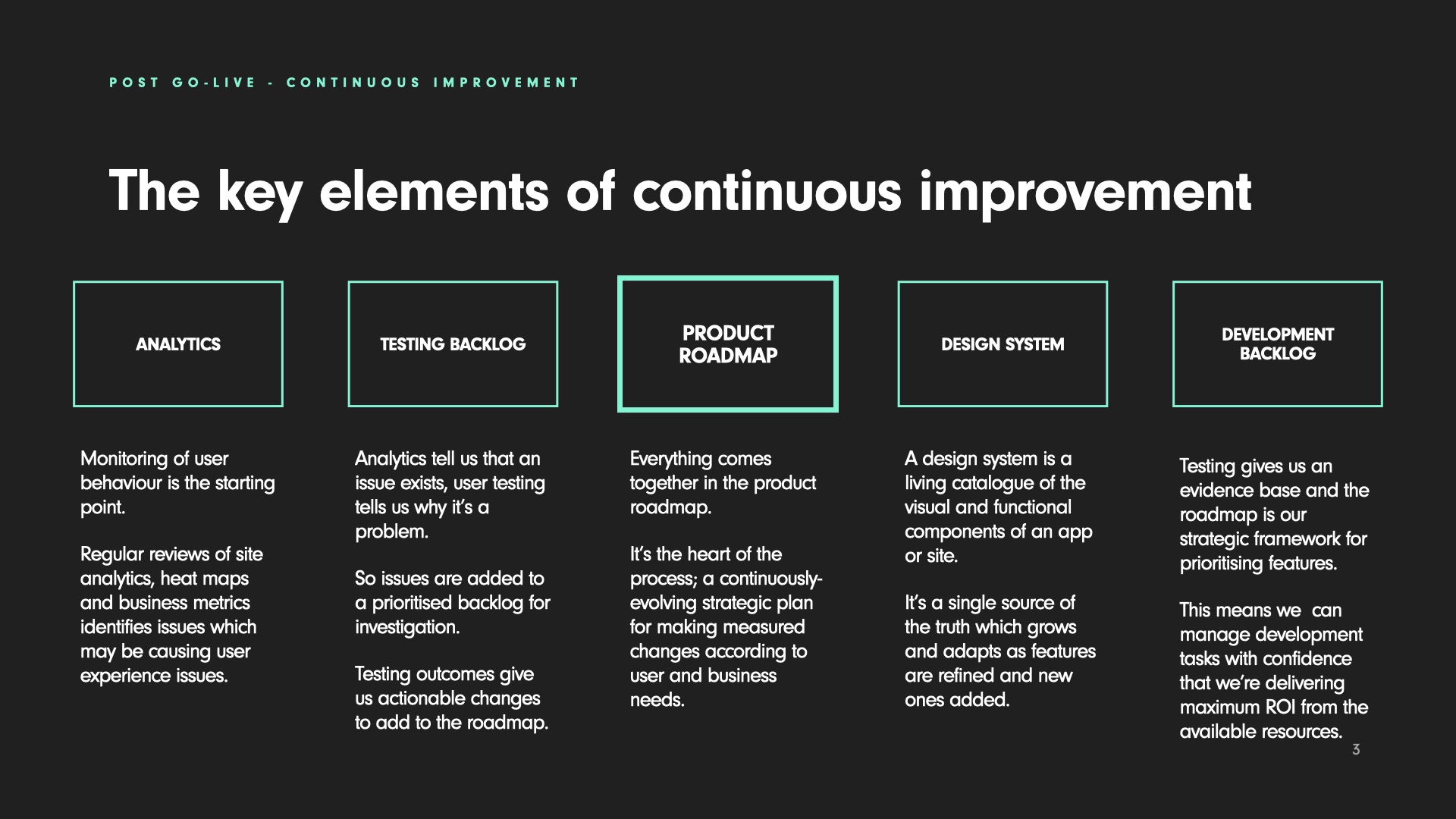 Over time I’ve built up a library of boilerplate content that I can use whole or adapt according to need. Many of my slides have become part of Deltatre’s standard bid response templates, covering areas such as accessibility policies, design methodologies and case studies.